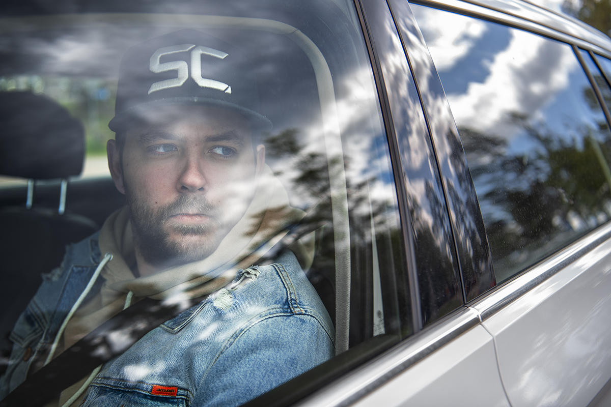 Christian kör in på parkeringen med musiken dånande ur högtalarna. Han har inte riktigt hunnit få på sig skorna ordentligt och går med bakkapporna nedtrampade.